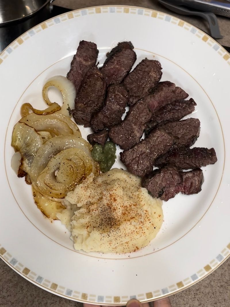 마지막에 양파도 남은 소스에 버무리고 매쉬포테이토도 만들어 스테이크랑 같이 먹으니까 이 조합 진짜 최고랍니다👍🏻