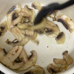 자른 양송이버섯을 오일 두른 팬에 볶은 후, 데미글라스 소스를 넣고 바글바글 끓입니다. 완성된 함박스테이크에 부어서 곁들여 드세요