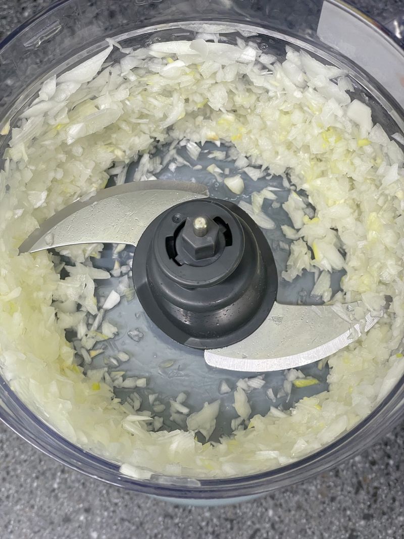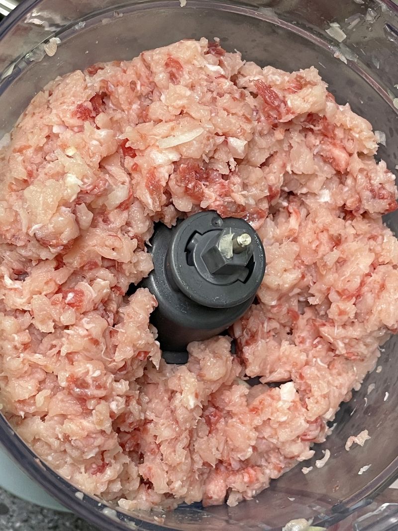 푸드프로세서에 소고기와 돼지고기를 갈아 줍니다