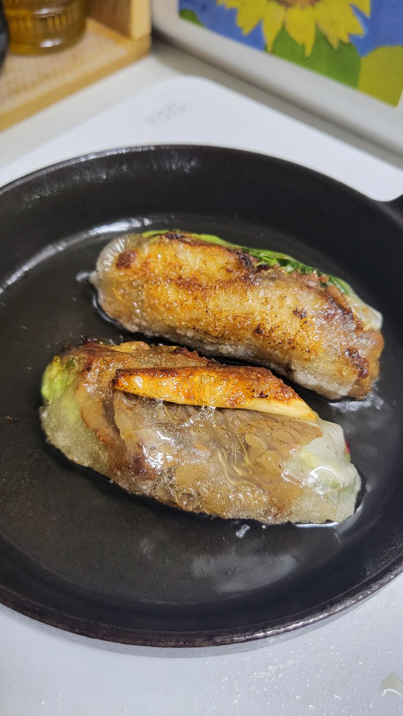 2.팬에 기름을 두른 후 라이스페이퍼 말이를 넣고 굽듯이 튀겨낸다.