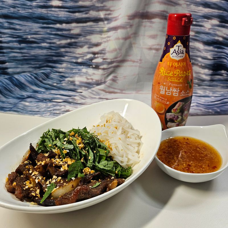 0사용한 재료 티아시아 월남쌈 소스 40g /다진마늘 2스푼 티아시아 라이스누들 취향껏 양념된 고기 아무거나 200g(돼지고기, 소고기 등) 채소류 아무거나 먹고싶은 만큼(상추, 깻잎 등)