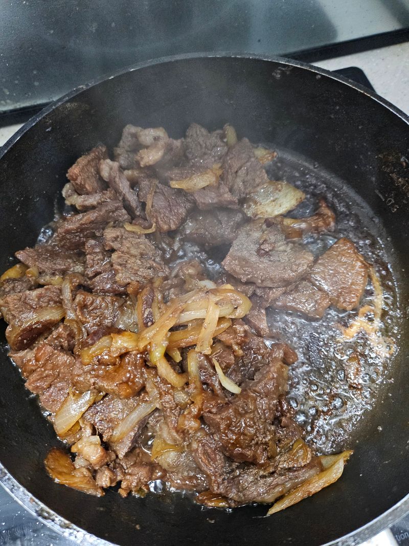 1. 양념된 고기를 야채 취향껏 넣고 굽는다!