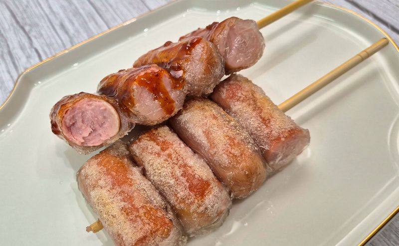 라이스페이퍼를 돌돌말아 쫀득한 떡처럼 만들 수도 있지만 통통한 소시지에 얇게 말아주니 재료 본연의 맛이 더 잘 느껴집니다😊