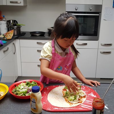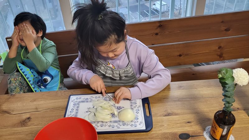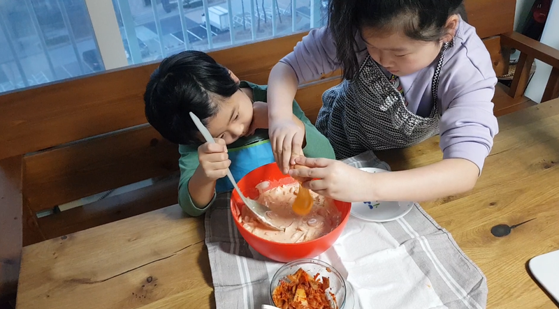 아이들이 직접 양파도 잘라보고, 반죽에 토핑과 김치를 넣어 휘휘 저어 반죽을 섞어 김치전 반죽을 만들었어요. 달걀도 톡톡 깨서 예쁘게 넣었지요~ 아이들이 직접 만든 반죽으로 김치전을 구워줬더니, 너무 맛있게 잘 먹네요~ 매운 김치도 이렇게 직접 요리를 해 보니 잘먹어 기특했답니다^^
