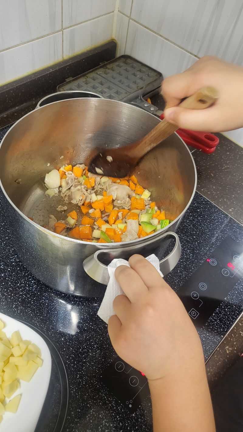 그다음 단단한 둥근호박을 볶고~ 감자넣고 볶고