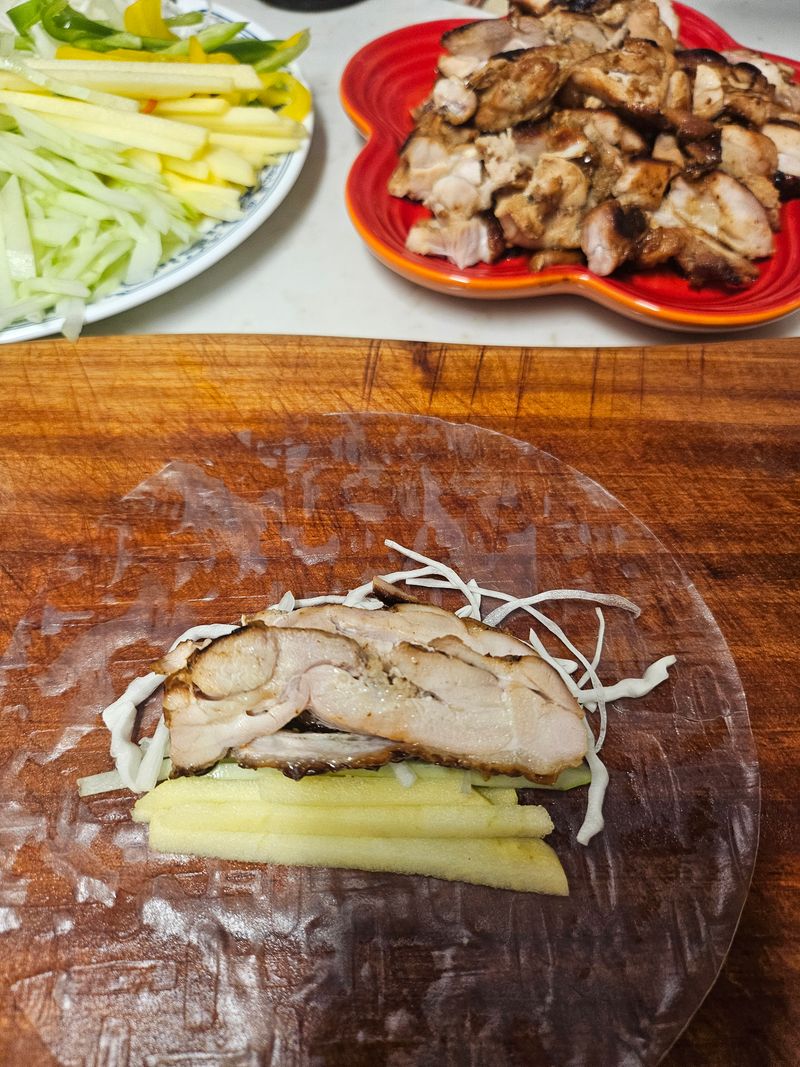 4. 라이스페이퍼 가운데에 채 썬 사과, 오이, 양배추, 피망을 넣고 자른 닭다리살을 올린다.