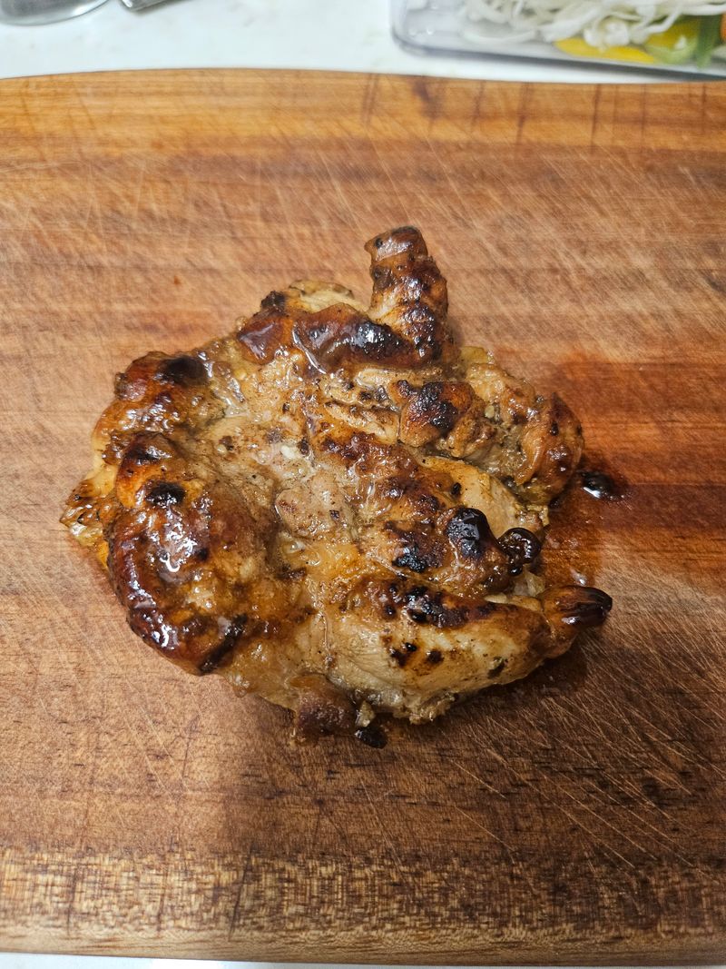 1. 전날 재워둔 닭다리살을 초벌한후 간장 양념을 발라 앞뒤로 노릇하게 구워준다.