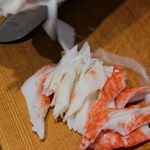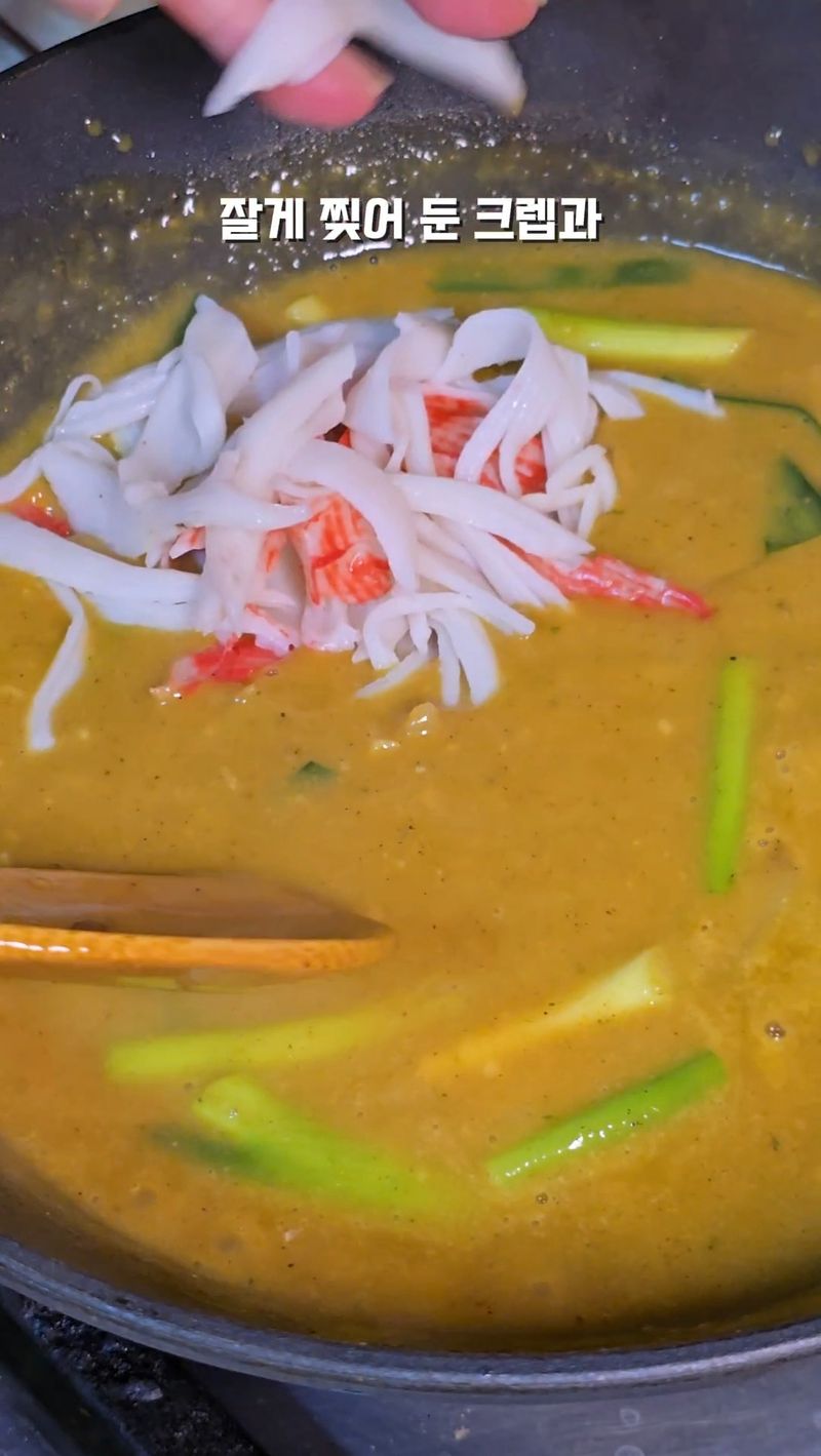 4. 잘게 찢은 크랩과 달걀물 넣어 뭉근히 계속 끓여줍니다.