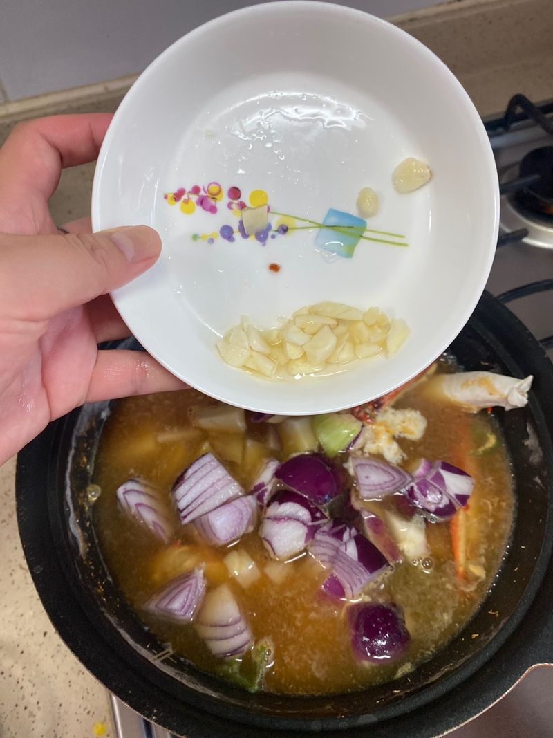 꽃게를 넣고 육수도 넣어 끓이다가