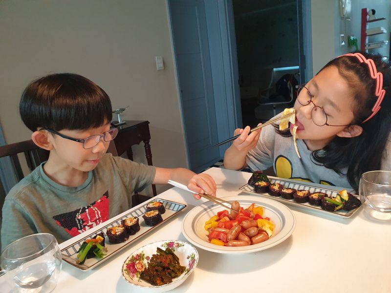 우리집 김밥교실~ 모두 함께 김밥재료를 열심히! 준비하고 아이들과 함께 직접 김밥을 말아 보았어요.이번엔 유부김밥을 말아보았거든요. 샘표간장/올리고당을 넣어 유부를 볶아서 넣었구요! 유부를 넣어 건강도 맛도 챙겼답니다. 아이들이 너무 꼼꼼하게 잘 말아서 놀랐고 기특했어요. "내가 말아서 먹으니까 더 맛있다"라며 엄지척을 하는 아이들의 모습에 행복하고 맛있는 식사 시간이 되었답니다. 집에서 아이들과 김밥교실을 열어보세요. 야채도 많이 먹을 수 있고 성취감도 느낄 수 있는 즐거운 시간이 될 것이랍니다.