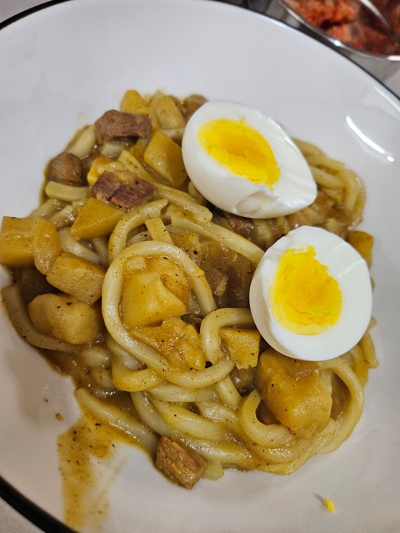 우동면을 접시에 담자마자 완성된 카레를 부어 드시면 좋아요!