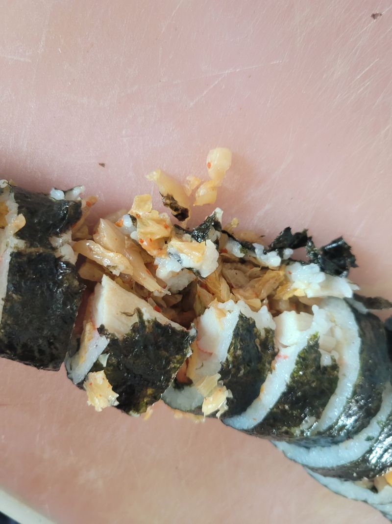 밥에 식초, 설탕, 소금 밑간하고 묵은지도 국물을 쭉 짜내고 송송송 썰어서 넣었고 햄과 계란, 맛살, 우엉, 단무지 까지 야무지게 준비해서 넣었는데..