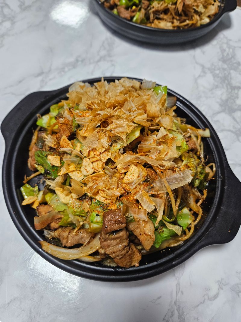 양배추를 잔뜩 넣은 삼겹살 야끼파스타입니다!