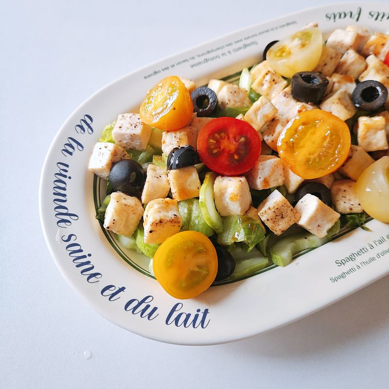 5. 채소와 오이를 밑에 깔고 구워준 두부와 방울토마토 올리브 올려 오리엔탈 드레싱 뿌려 마무리해준다.