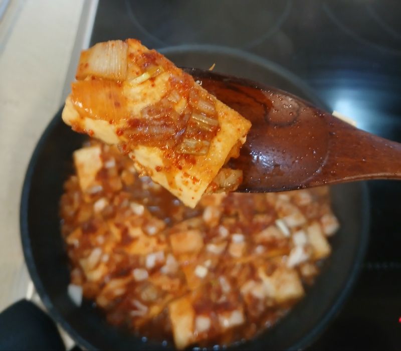 *구운 두부' 위에 '양파'와 '양념장'을 넣고 약한 불에서 졸여줍니다.