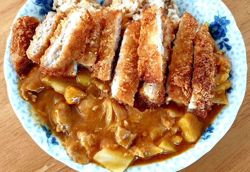 6. 예쁜 그릇에 밥과 카레를 담고 마지막으로 노릇노릇하게 튀긴 돈까스를 먹기 좋게 썰어 올려 놓으면...