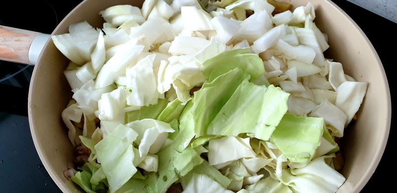 4. 돼지고기와 고구마가 익어가기 시작하면 깍둑썰기 해 놓은 양배추와 양파를 넣은 다음 물을 넣고 재료가 익을때까지 끓여줍니다.
