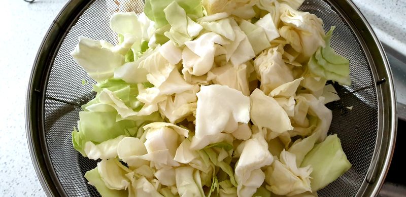 1. 우선 양배추를 듬성듬성 자른 다음 식초물에 약 5분간 담가둔 후 체에 받쳐서 물기를 빼 줍니다.