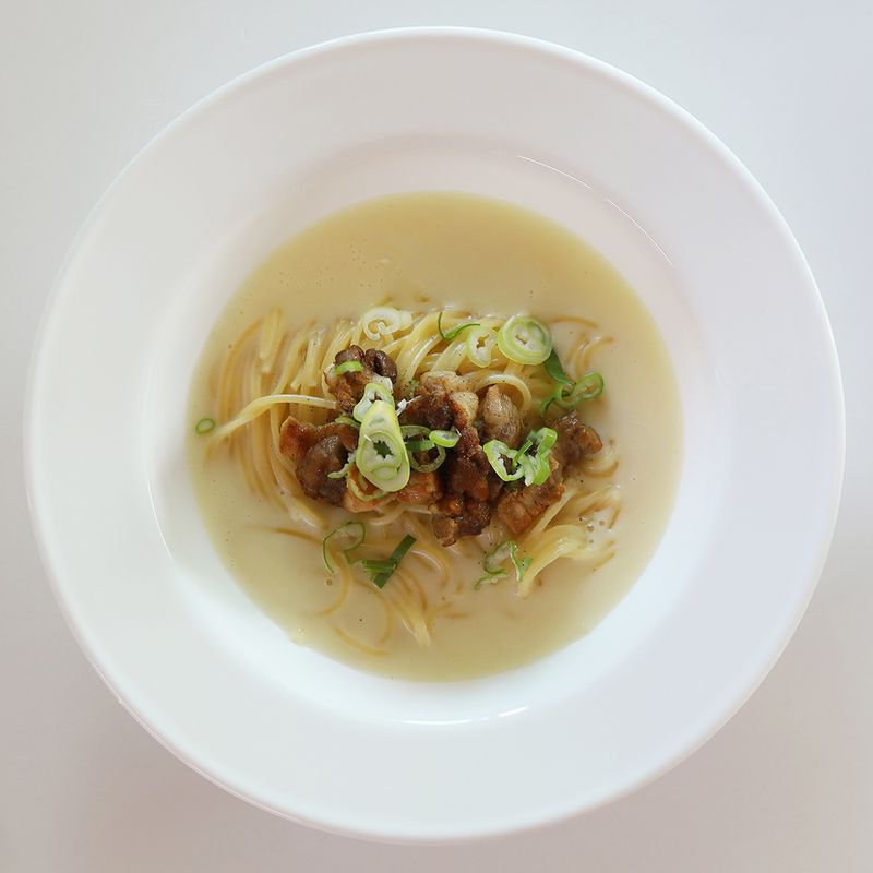 재료 : 크림스프 30g, 스프용 물 300g, 파스타면(스파게티) 100g, 슬라이스치즈 1장, 구운 삼겹살, 대파 조금, 소금, 후추
