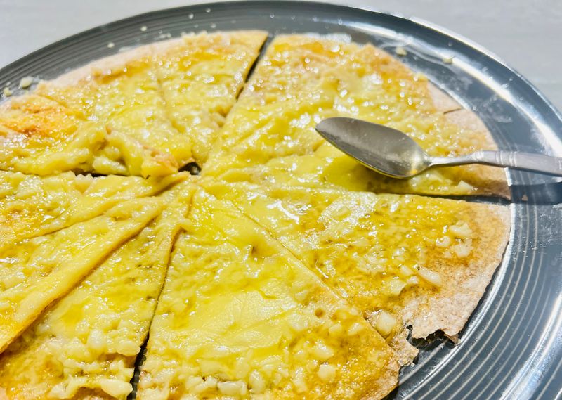 또띠아에 다진 마늘 피자치즈 넣고 전자렌지로 돌리고 마지막에 꿀뿌려먹기