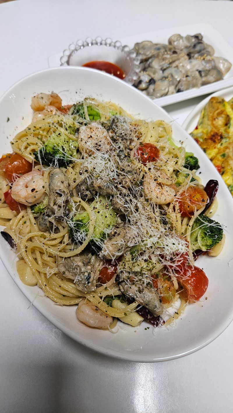 감바스에 파스타면이 빠질수 없죠!! 올리브유 소스에 파스타면까지 삶아 넣으면 굴새우 감바스 파스타!!! 크리스마스나 연말에 연초에 제철 굴로 만든 감바스