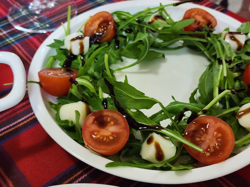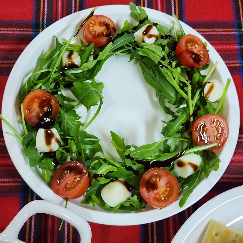 루꼴라 동그랗게 올려주고 방울토마토와 스틱치즈 잘라 올리고 발사믹 휘리릭 뿌려주니 색감도 이쁘고 모양도 이쁜 리스샐러드 완성