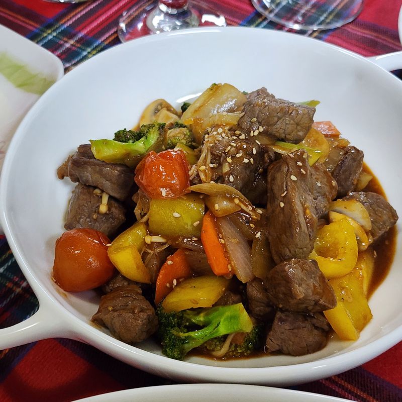 올리브유 듬뿍 두르고 각종야채와 소고기 달달 볶다가 스테이크소스와 케찹 넣고 볶아서 찹스테이크 완성.