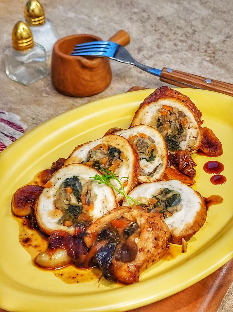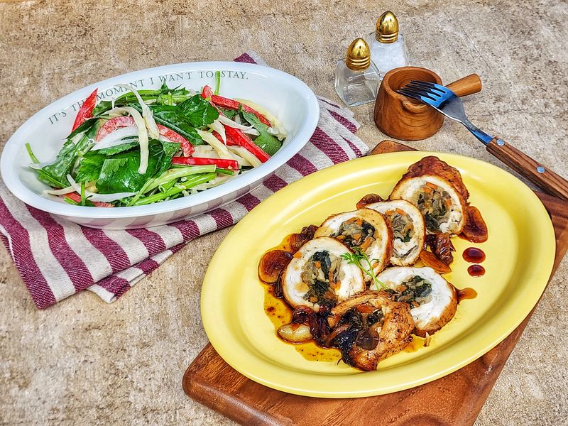 룰라드 속에는 제가 사는 지역에서 유명한 뽕잎 나물과 알록달록 채소를 양념에 볶아 듬뿍 넣었고,