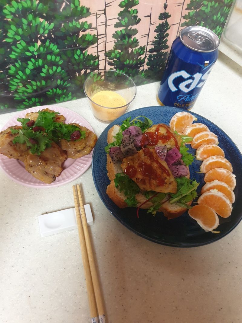 겨자로 톡쏘는맛 내는 닭가슴살 오픈샌드위치와 맥주한잔!!!