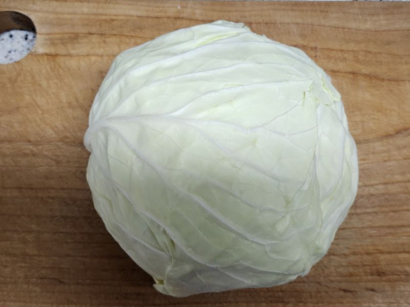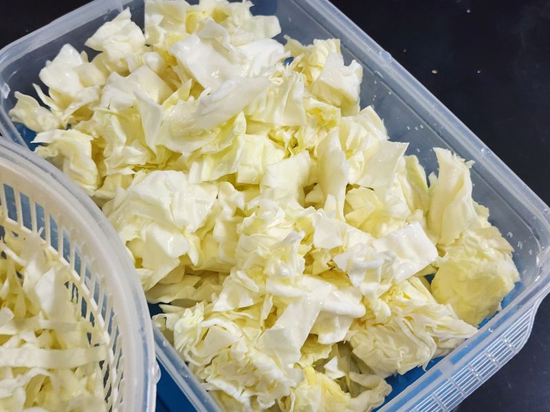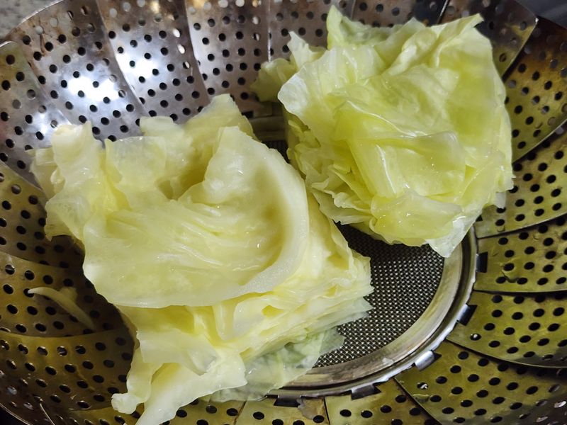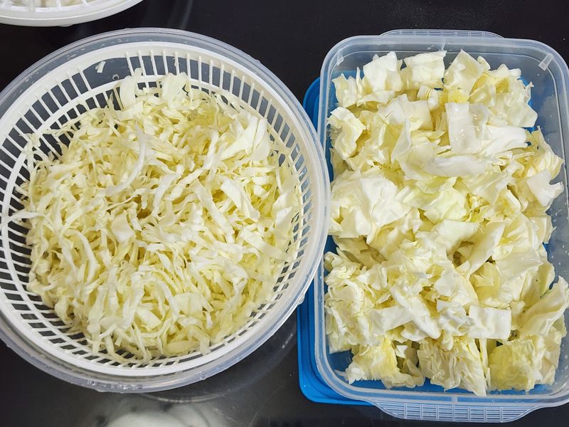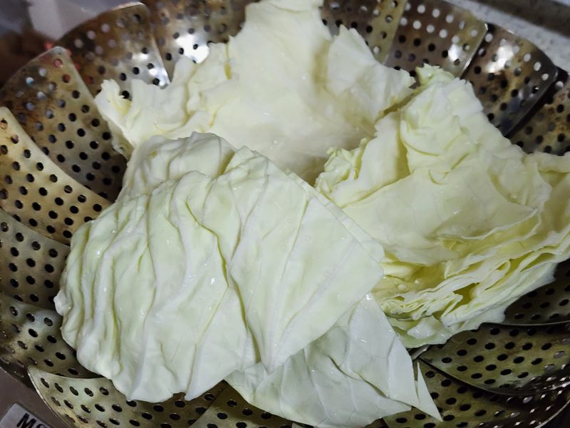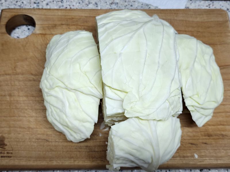 양배추 사방을 자르고 겉부분과 맨 위 사각부분은 찜용으로 먹고