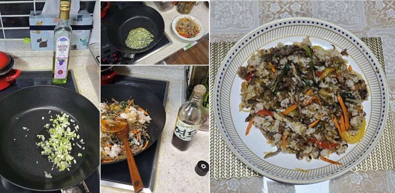포도씨유에 파기름을 낸 다음에 냉장고에서 먹다 남은 잡채를 꺼내어 볶다가 밥과 연두 2스푼으로 마무리