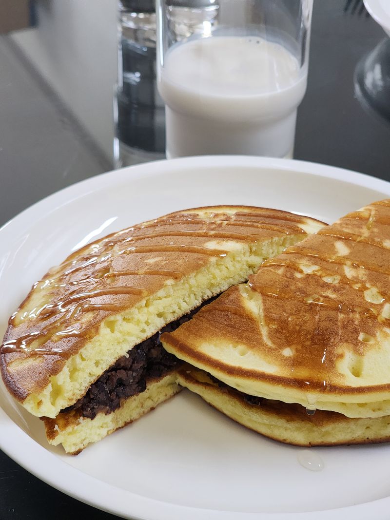 수수팥떡 고물이 너무 많이 남아서 새알을 만들어 굴려먹을까 어쩔까 고민하다가팥고물에 따뜻한물과 올리고당을 살짝 넣어 팥앙금으로 변신시킨다음 핫케익 구워서 사이에 넣어먹으니 또 색다른 맛이었어요. 흡사 붕어빵 같기도 하고요. 남은팥고물로 거의 두끼를 해결했네요. 남은 팥고물있으면 이렇게도 한번 드셔보세요.^^