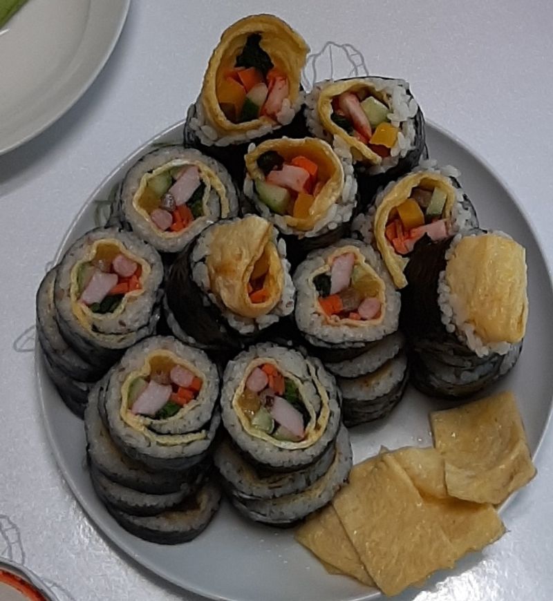 유부, 당근, 우엉, 맛살, 김 등 흔히 구할 수 있는 재료로 만들어 봤어요. 제가 만들었지만 아주 맛있겠네요^^
