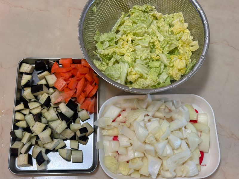 🔹 다루기 까다로운 가지와 양배추도 새미네 요리해요에서 알려준대로 칼질하니 더이상 겁나지 않아요! 신이나서 양파와 당근도 다 같이 깍둑썰기로 도전해서 시도했답니다! 🙂