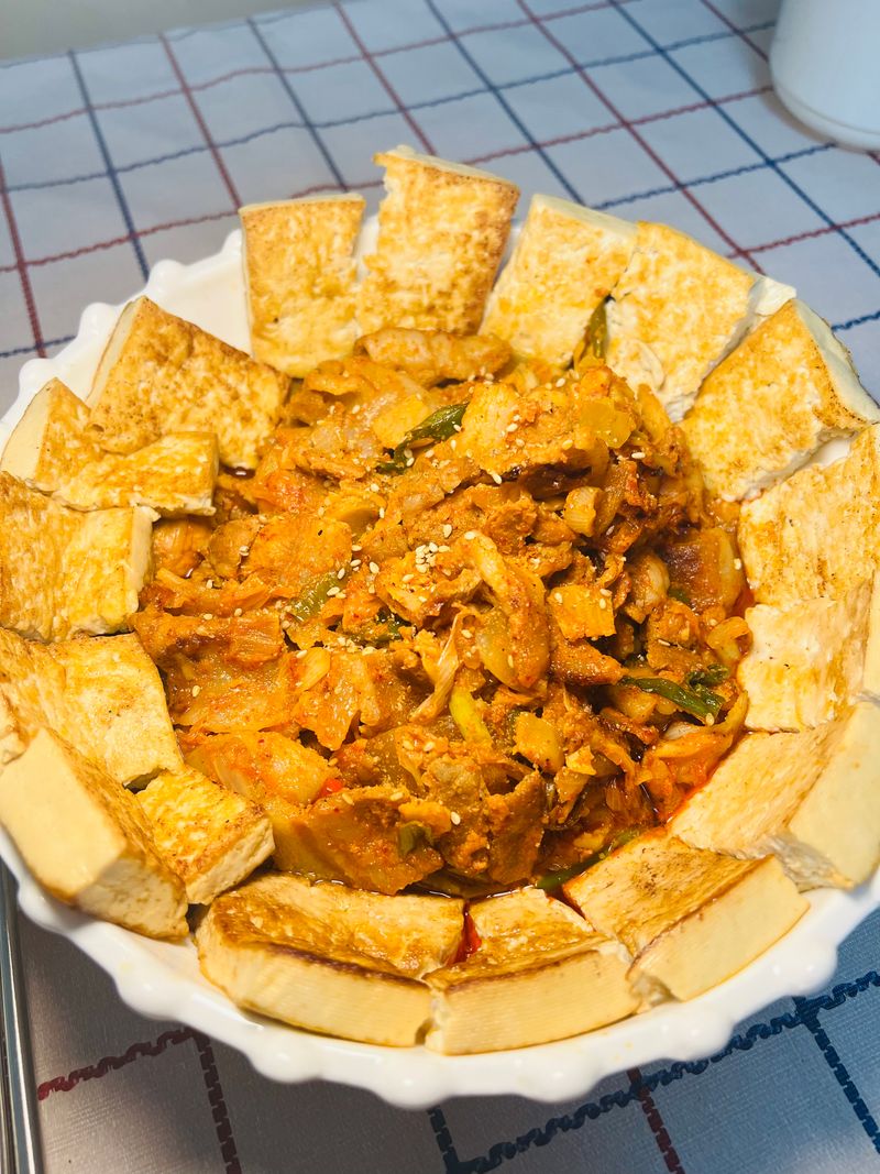 두부전은 제육김치두루치기와도 잘 어울리는데요. 똑같은 방법으로 두부전을 만들어주고,