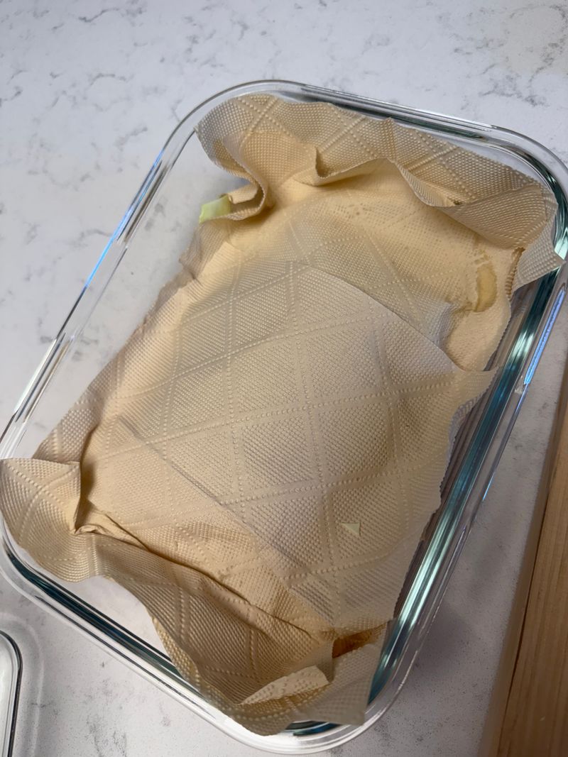 통 안에 예쁘게(?) 쌓아주고 다시 키친타올로 덮었습니다.