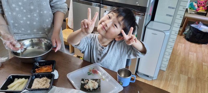 밥에 소금간이랑 깨뿌려서 아이들이 조물조물하고 야채랑 참치넣어서 돌돌말으면 완성^^♡