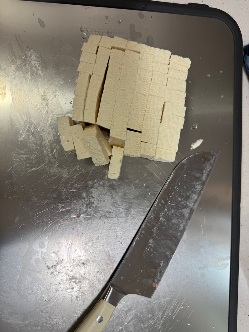 3. 두부를 먹기 좋은 크기로 썰어요