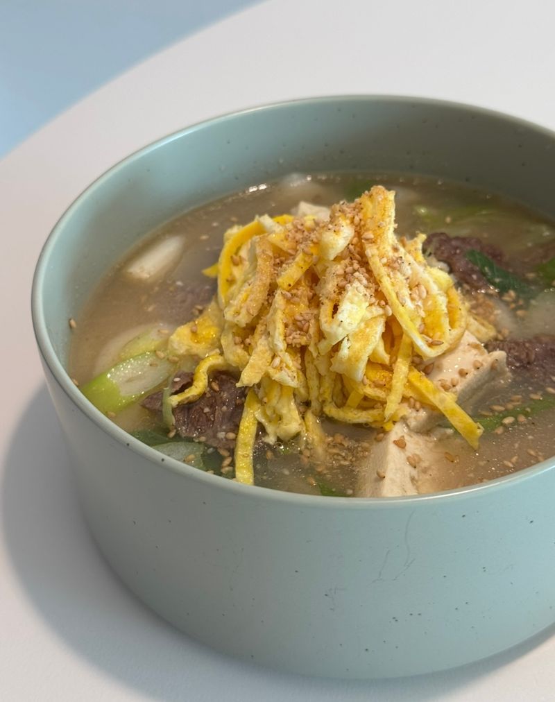 탄수화물이 빵빵한 떡국에 계란 지단을 듬뿍 올리고 두부를 송송 썰어 넣어 부족한 단백질을 보충했어요💛 📍(계란지단) 계란을 2개만 풀어도 한 장 이상 나와요! 📍떡국에 넣을 고기를 마늘과 함께 볶아서 풍미를 더해요!(+연두)