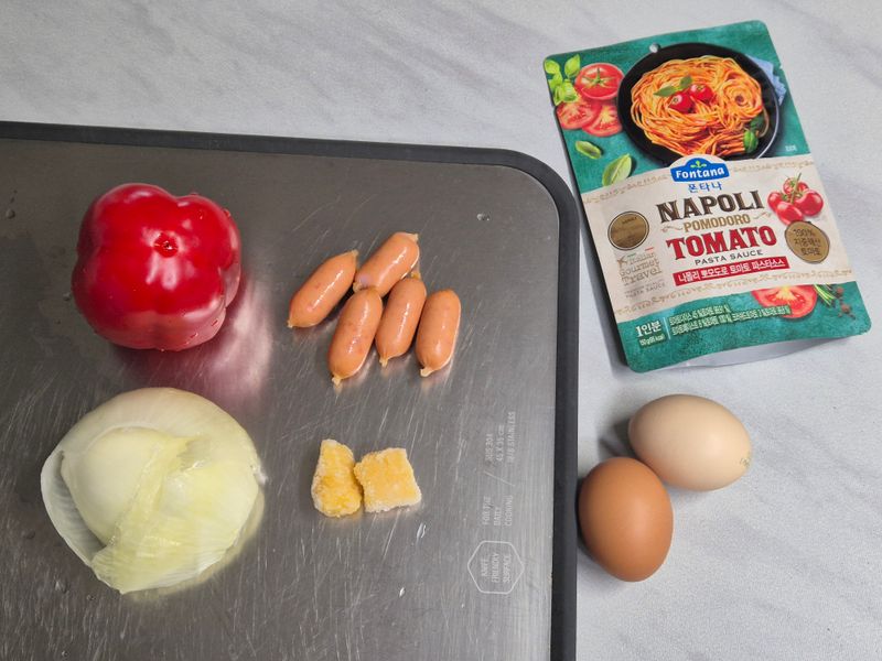 처음에는 레시피대로 빨간 파프리카만 준비했는데 재료 썰다 보니 노란 파프리카도 있으면 더 먹음직스러울 것 같아서 추가했어요!