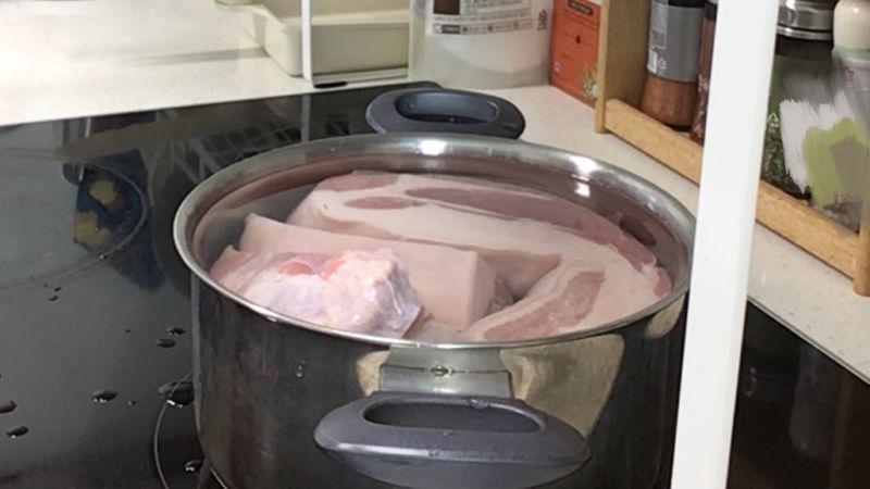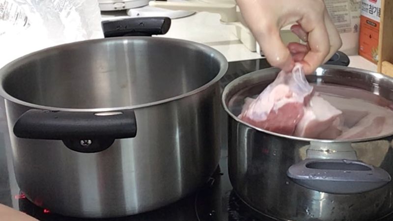 뜨거운 물에서 꺼낸 고기를 조금 식혀 조직이 단단하게 해준 후, 썰어주면
