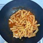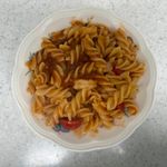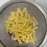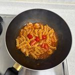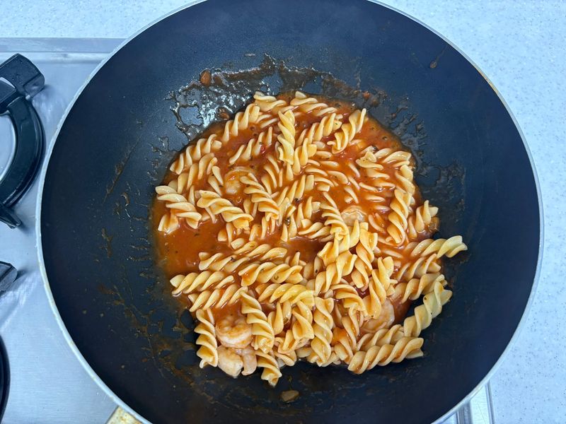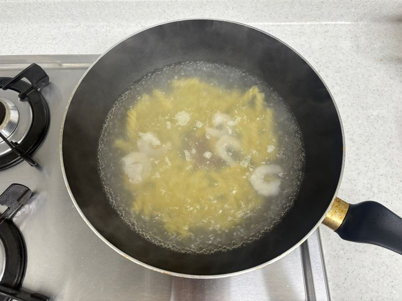 혼자 파스타를 만드는 건 처음이었는데, 레시피대로 따라하니까 정말 간단해서 놀라웠고, 앞으로도 잘 만들 수 있다고 생각했어요. 그리고 저는 집에 푸실리 파스타면밖에 없어서 숏파스타를 만들었습니다! 그리고 평소 해산물 파스타를 좋아해서 집에 있는 냉동 새우랑 방울토마토를 추가했어요.
