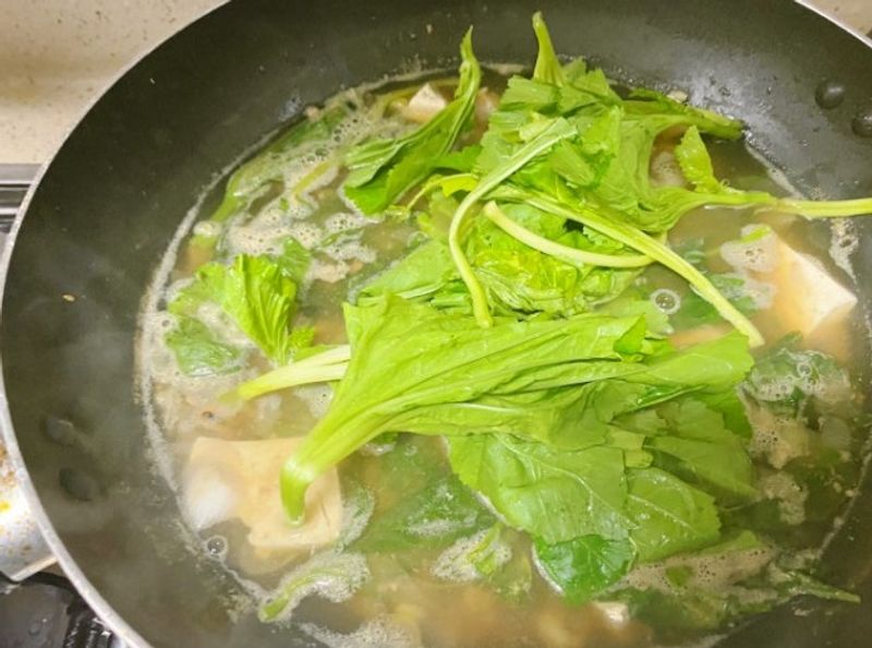 시금치, 대파, (청양고추)를 넣고 한소끔 끓이면 완성!