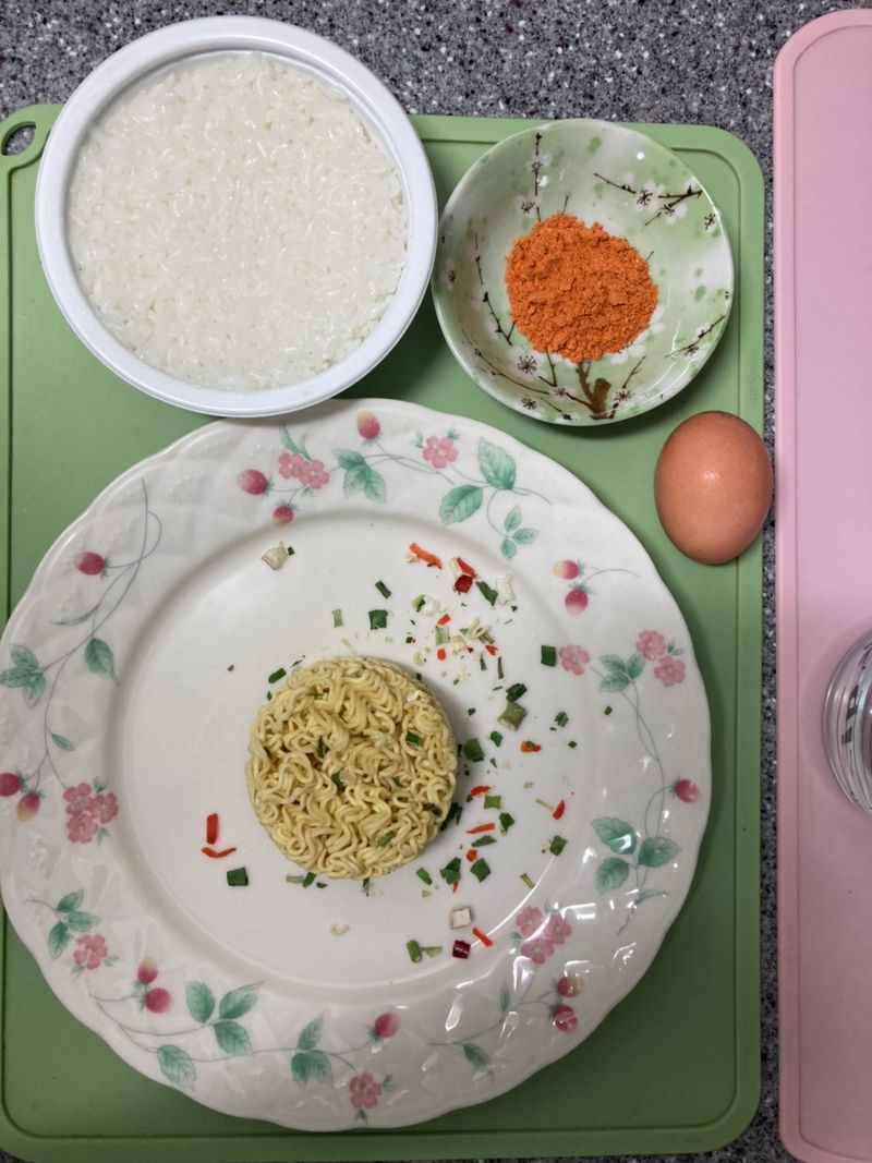 * 작은 컵라면 1개, 흰 쌀밥, 계란 1개, 물 150ml, 식용유