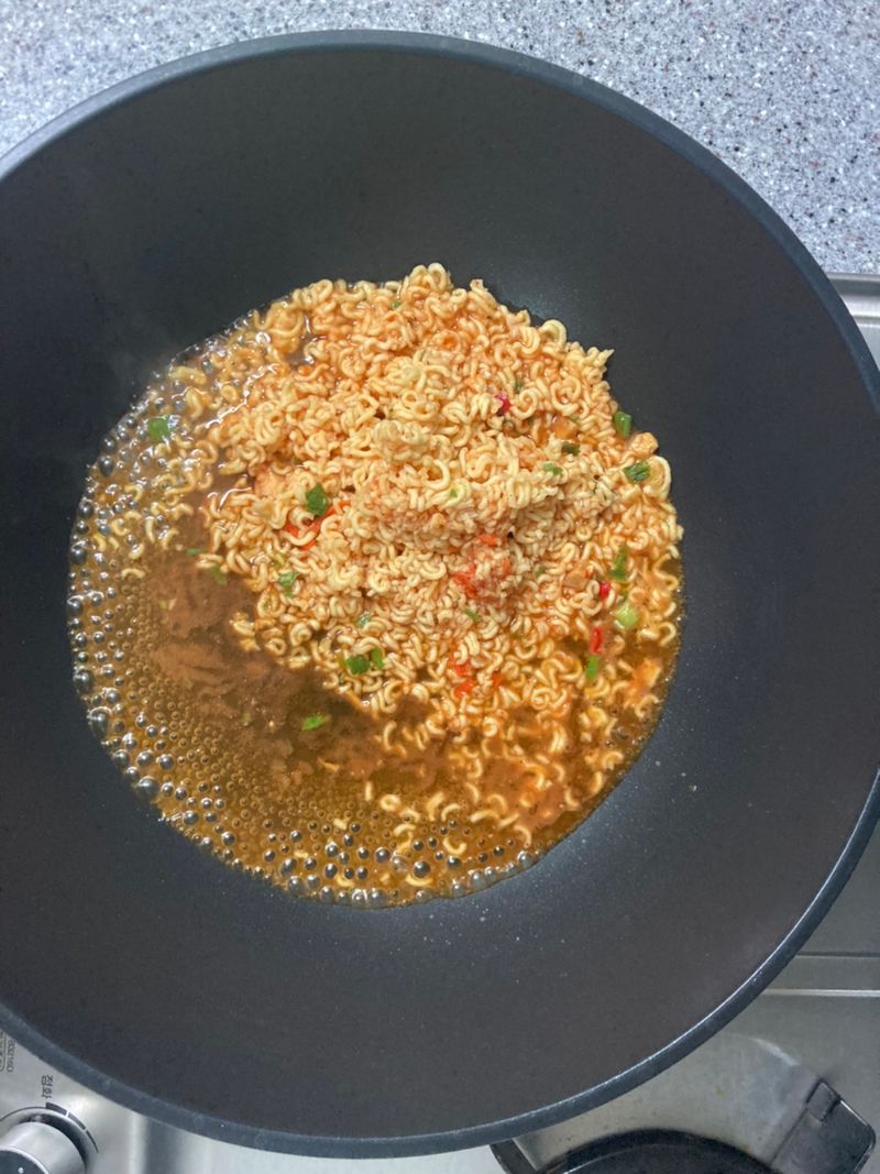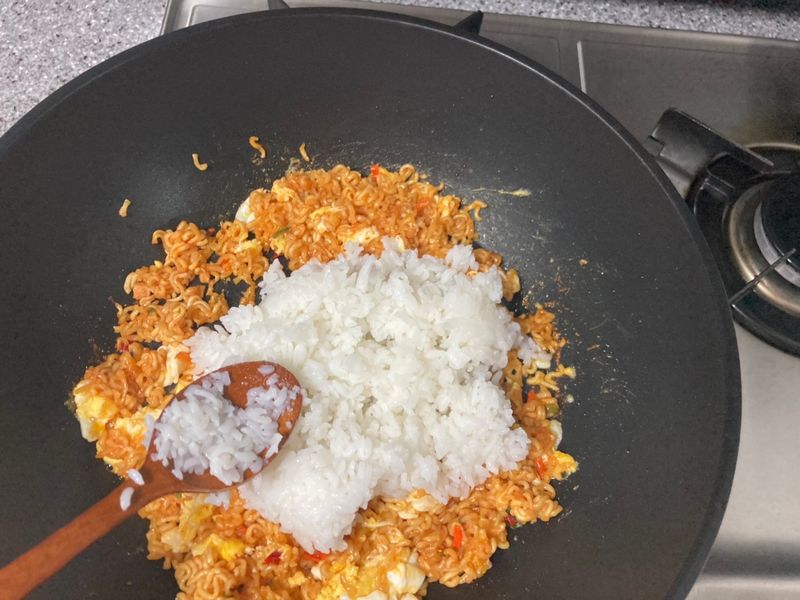 5. 스크램블 하듯 풀면서 라면과 섞고 흰 밥을 넣고 볶아주세요.
