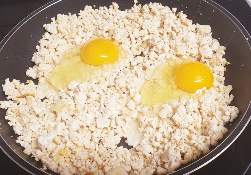 팬에 기름을 두르고 물기를 뺀 으깬 두부를 넣고 살짝 볶아주다가 계란 2개 넣고 다시 볶아 줍니다.