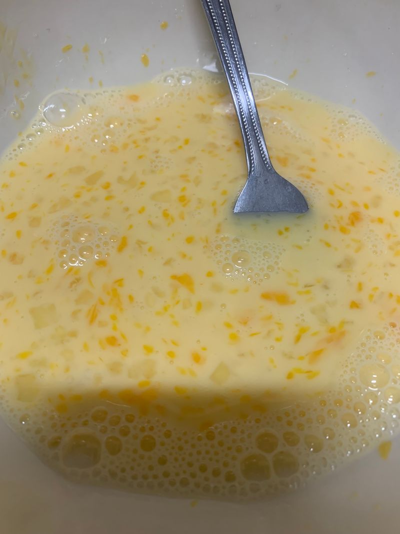 처음에 계란 하나와 우유 한컵 정도에 설탕한 스푼을 넣고 섞었다. 계란을 바로 냉장고에 꺼내서 넣으니까 잘 섞히지는 않았지만, 할 수 있는 만큼 열심히 섞은 후