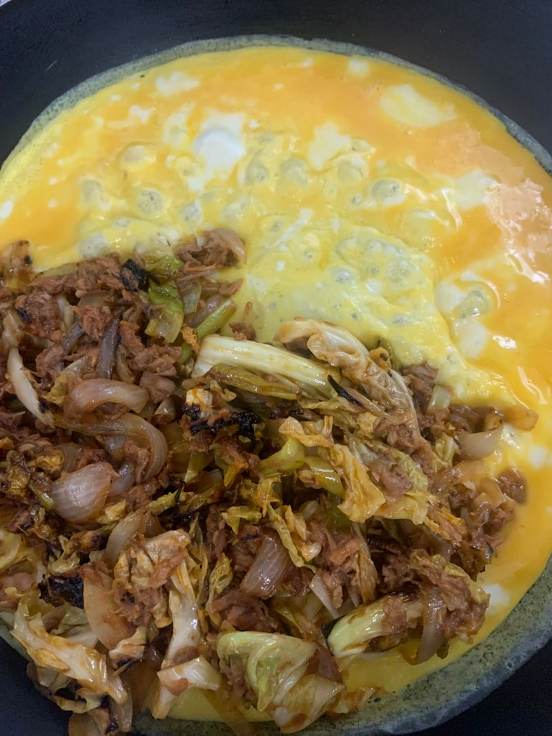그 후에 치즈를 넣고 녹인 후 계란물까지 넣었다. 근데 또 문제점이 있다면 내가 뒤집기를 정말 못해서 아주 많이 걱정했는데, 다행히 반으로 잘 접을 줄 알았는데, 내용물이 너무 많아 터져버렸다...
