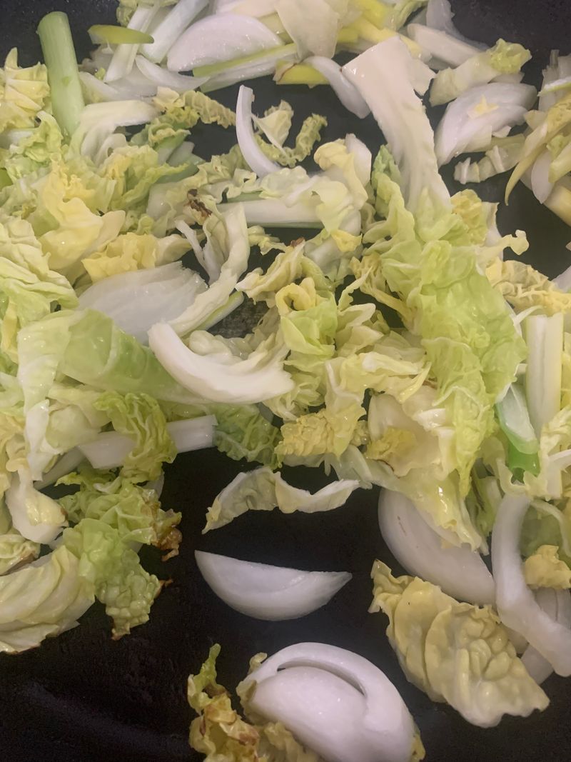 우선 야채를 썰어야하는데, 팁에서 정해진 재료 말고 냉장고에 있는 야채들 사용해도 된다 하길래! 양배추, 파, 양파를 사용하기 로 했다! (최대한 길게 썰려고 노력했다)