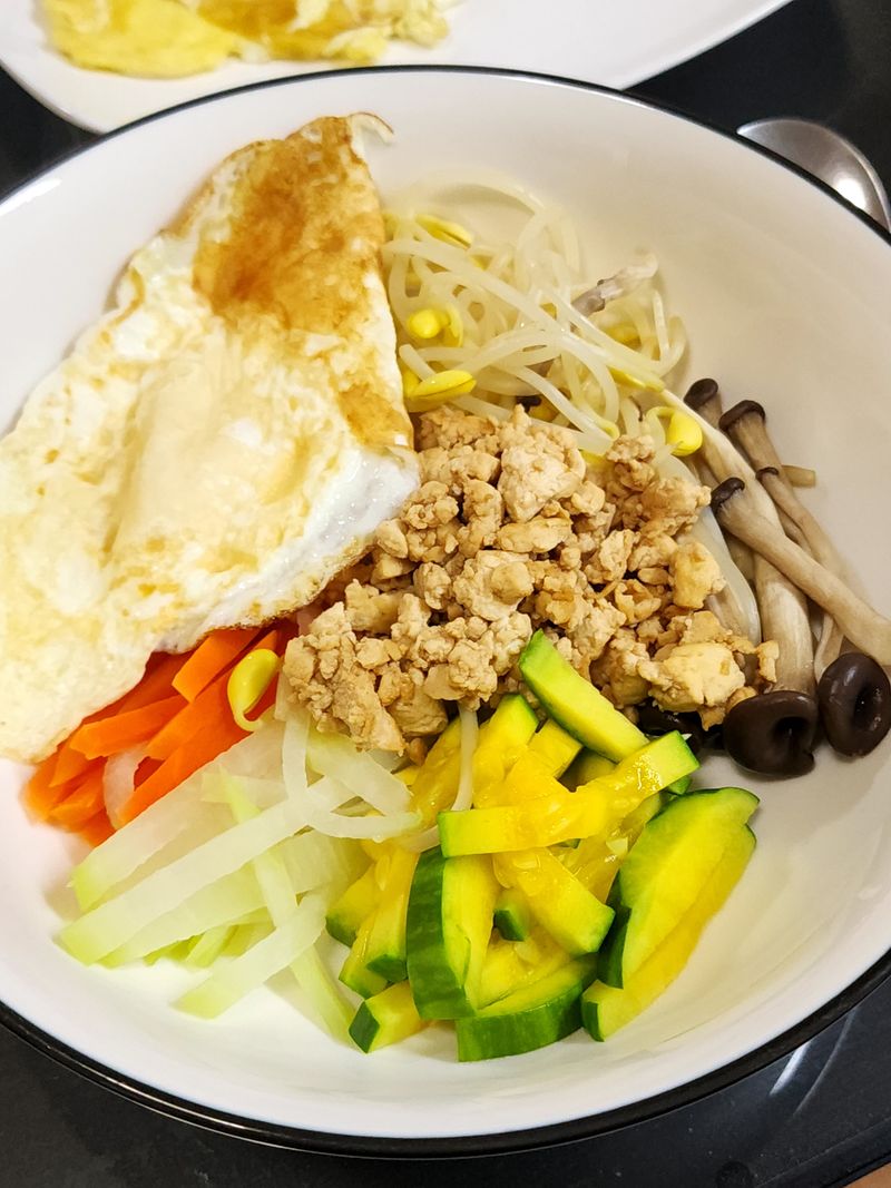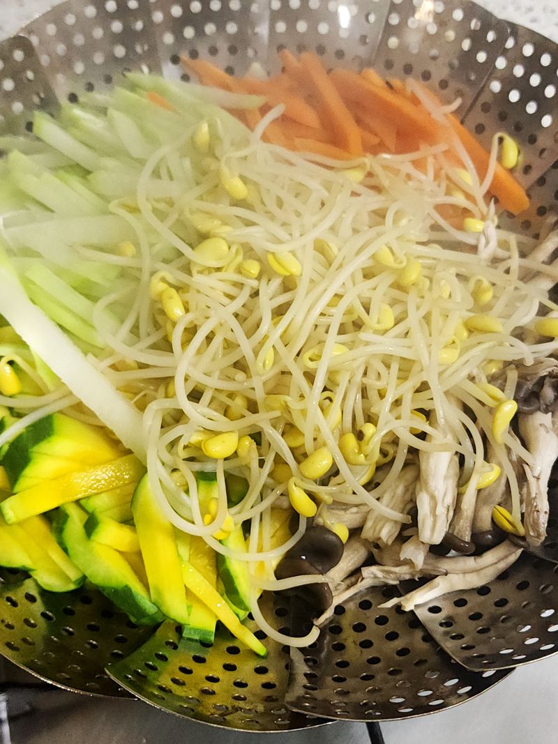 야채를 쪄서 만드는 건강한 비빔밥입니다.